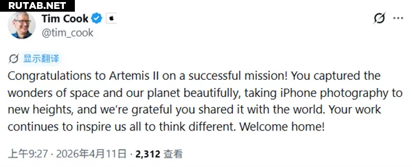 Генеральный директор Apple Тим Кук опубликовал запись, в которой поздравил NASA с триумфом миссии «Артемида-2».