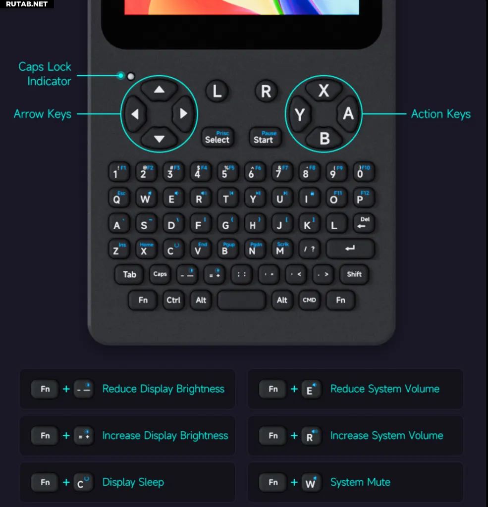Для ввода данных устройство включает 67-клавишную силиконовую QWERTY-клавиатуру, предназначенную для программирования, работы с командной строкой и обычного набора текста. Также есть выделенные клавиши действий, навигационные элементы и функциональные сочетания для регулировки яркости и громкости. Для управления вводом с клавиатуры и системными настройками встроен микроконтроллер RP2040.