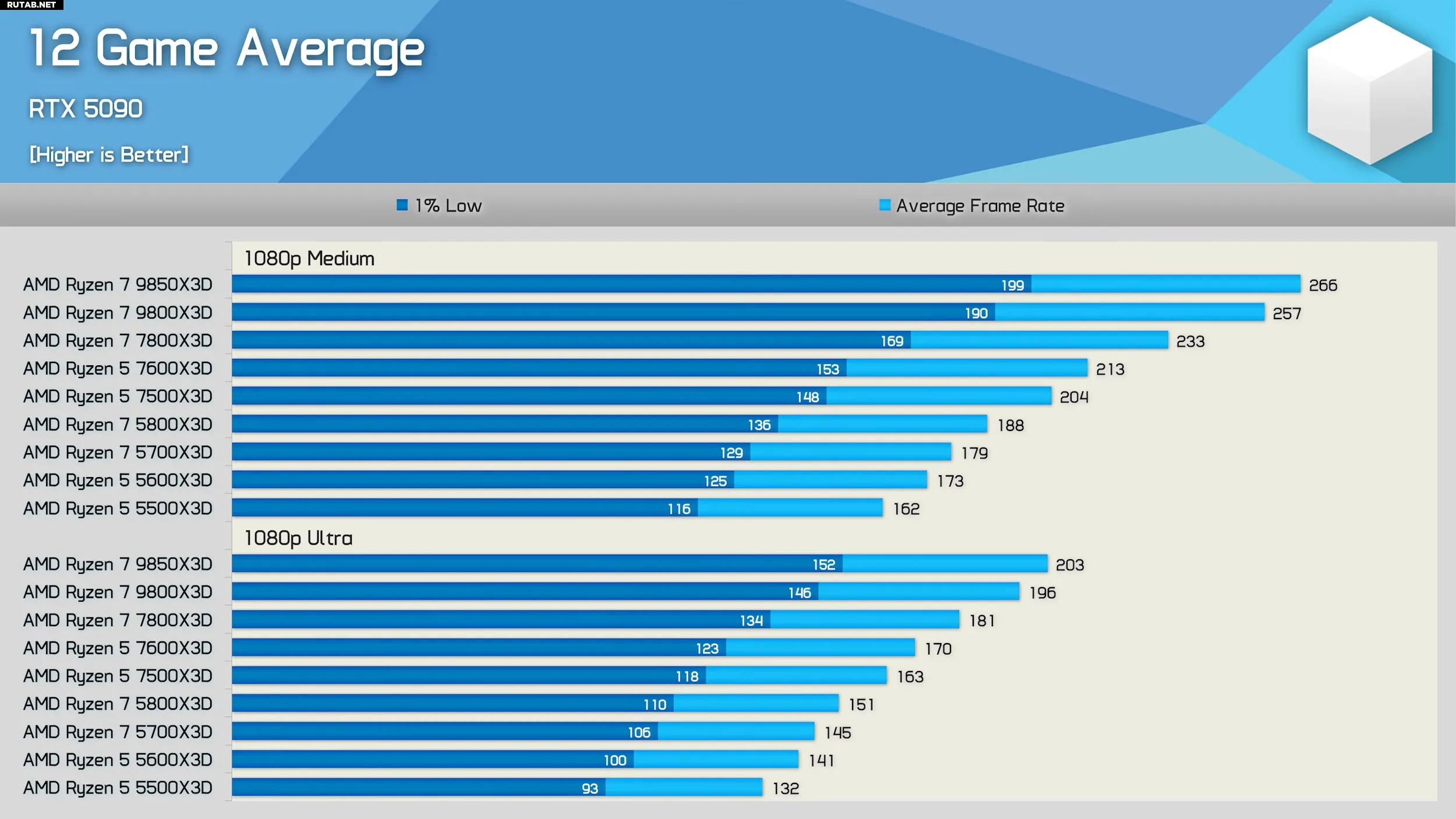 Согласно обзору от Hardware Unboxed, в котором использовалась видеокарта RTX 5090, были протестированы средние показатели FPS в 12 играх на процессорах AMD Ryzen 5 и Ryzen 7 с технологией 3D V-Cache, охватывающих три поколения архитектур: Zen 3, Zen 4 и Zen 5.