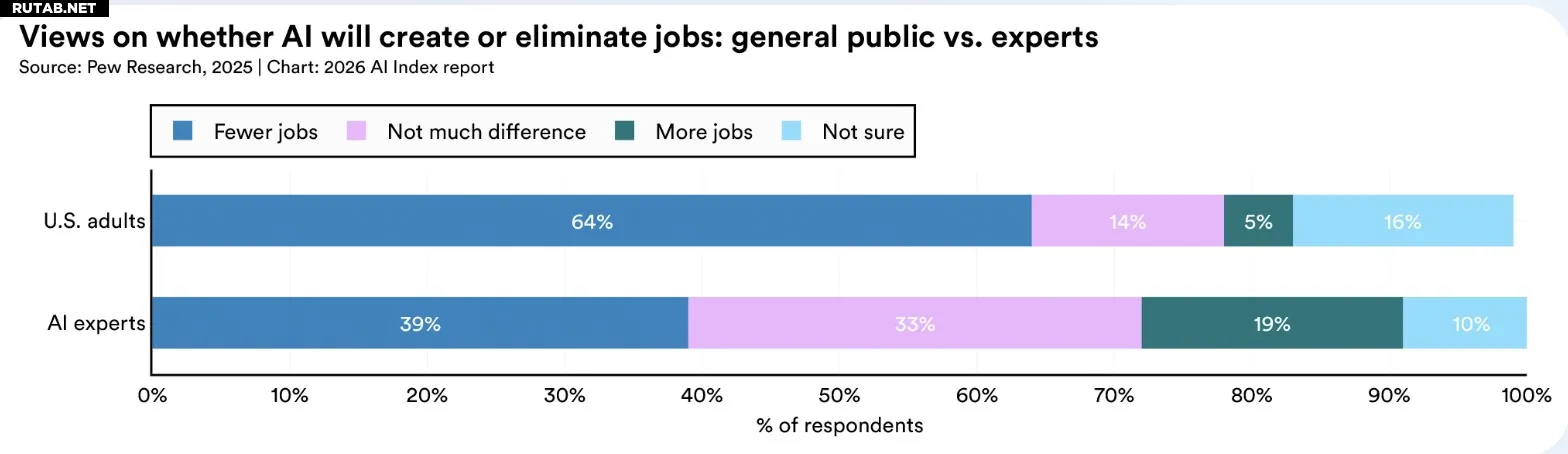 Ежегодный отчёт Стэнфордского университета об индустрии искусственного интеллекта, опубликованный в понедельник, 13 апреля 2026 года, указывает на растущий разрыв между мнением экспертов по ИИ и широкой общественности. Основной тренд — рост беспокойства вокруг технологии, особенно в США, где люди опасаются её влияния на рабочие места, медицину и экономику.