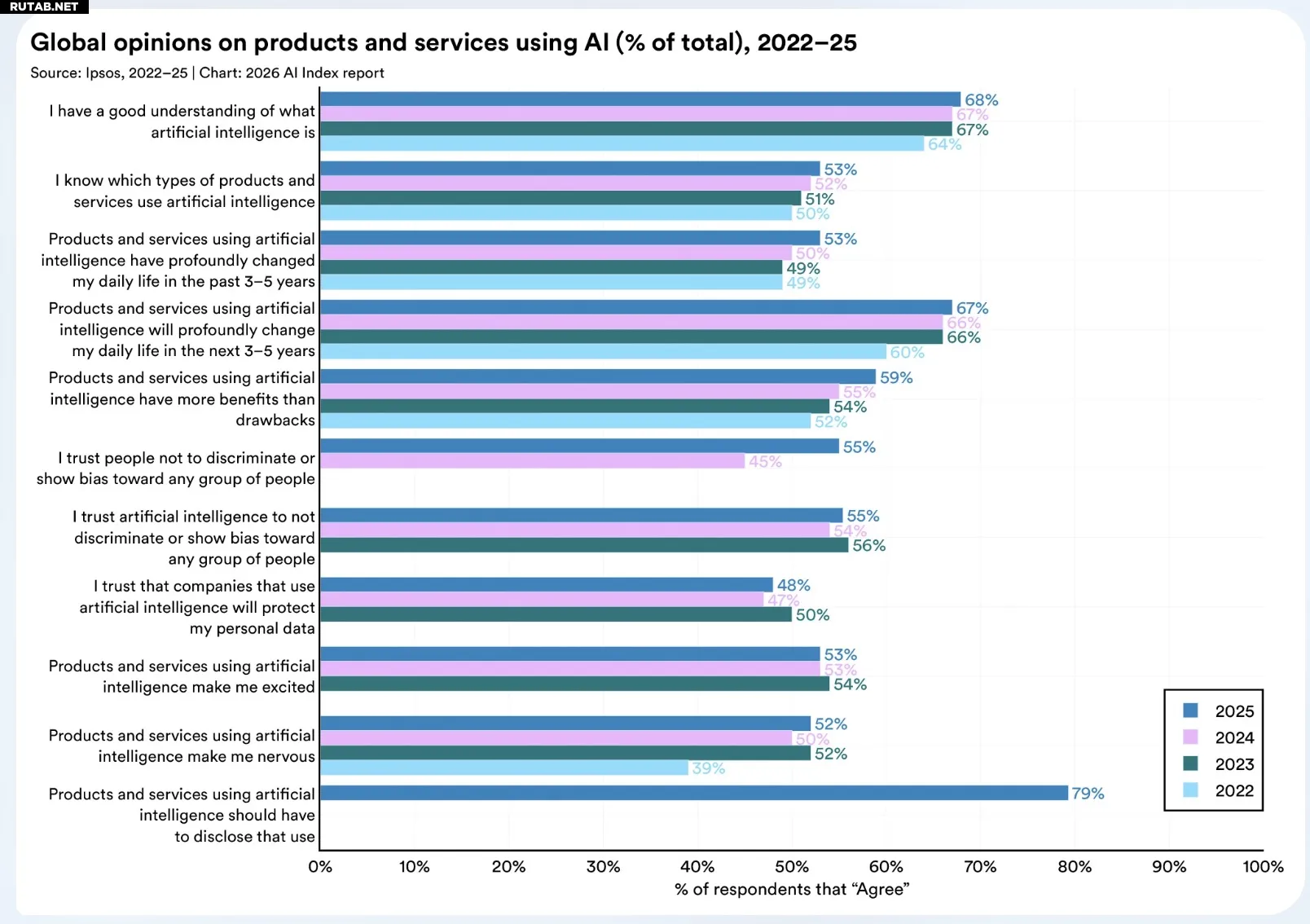 Несмотря на опасения, глобальный показатель тех, кто видит в ИИ больше пользы, чем вреда, немного вырос — с 55% в 2024 году до 59% в 2025. Однако доля людей, которых ИИ «нервирует», также увеличилась за тот же период с 50% до 52%.