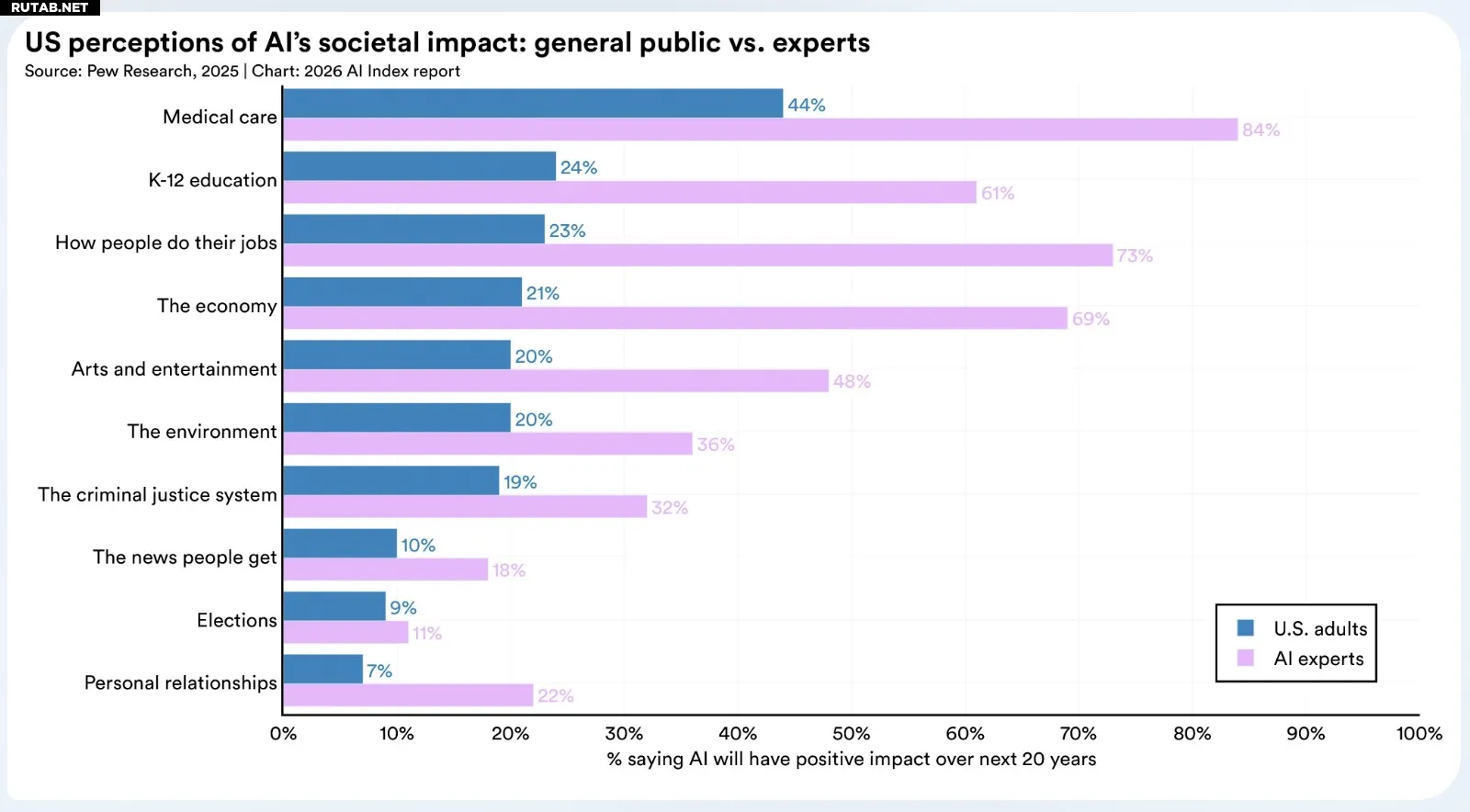 - Медицина: 84% экспертов прогнозируют положительное влияние, среди общественности так считают только 44%.