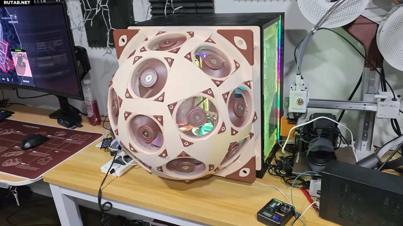 Конструкция «Суперкупола» была спроектирована так: пять вентиляторов расположены по окружности в верхней части купола, еще девять — у его основания, ближе к корпусу ПК. Печать всех деталей на 3D-принтерах Bambu Labs заняла несколько дней. Внешне результат выглядит впечатляюще, хотя, как признается сам автор, управление кабелями получилось «немного катастрофическим». При этом система работала «довольно тихо», если провода не задевали лопасти. Все вентиляторы настроены на вдув воздуха, создавая внутри корпуса положительное давление.