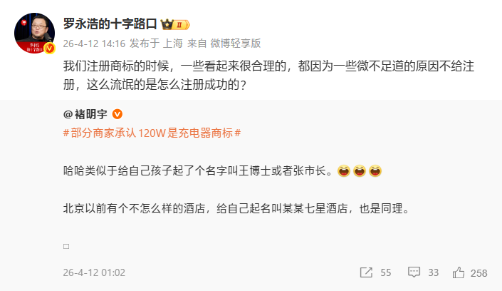 Ло Юнхао раскритиковал регистрацию «120W» как товарного знака для зарядных устройств
