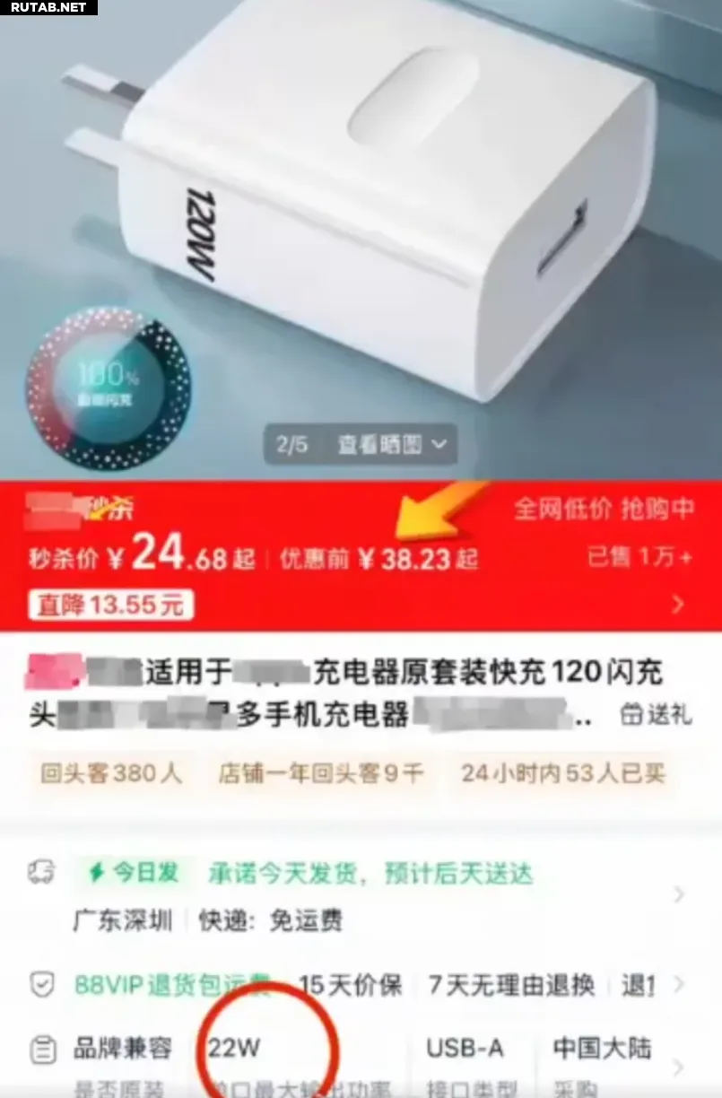 На китайских маркетплейсах, таких как JD.com и Taobao, можно найти зарядные устройства с маркировкой «120W Super Flash Charge» по цене ниже 50 юаней. Однако покупатели жалуются, что реальная скорость зарядки крайне низка, а фактическая выходная мощность составляет лишь около 22,5 Вт, что сильно отличается от заявленной.