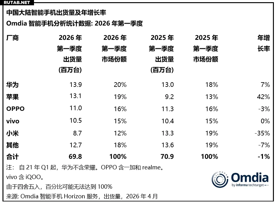 Согласно отчёту аналитической компании Omdia, рынок смартфонов в материковом Китае в первом квартале 2026 года показал небольшое снижение на 1% в годовом исчислении. Общий объём поставок составил 69,8 млн устройств. Основной причиной спада аналитики называют рост стоимости компонентов памяти, что привело к повышению цен на модели среднего и бюджетного сегментов у некоторых брендов и снизило покупательскую активность.