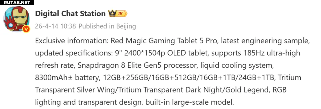 Согласно утечке, Red Magic Gaming Tablet 5 Pro может получить компактный 9-дюймовый OLED-дисплей с разрешением 2400 x 1504 пикселей. Ожидается, что панель будет поддерживать частоту обновления до 185 Гц, что указывает на сильный акцент на плавной игровой картинке. Устройство может работать на чипсете Snapdragon 8 Elite Gen 5 в паре с продвинутой системой жидкостного охлаждения, предназначенной для управления нагревом во время длительных игровых сессий.