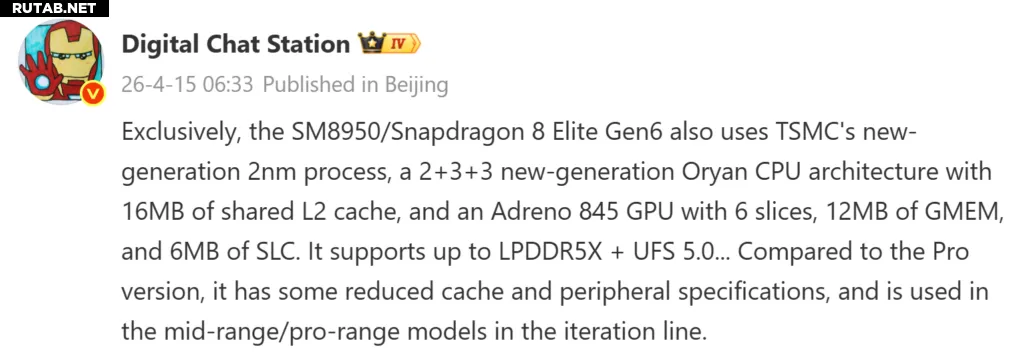 Тот же источник указывает, что стандартная версия имеет немного уменьшенные объёмы кэша и возможности периферии по сравнению с Pro-моделью. Более ранние отчёты свидетельствуют, что Snapdragon 8 Elite Gen 6 Pro с номером модели SM8975 может получить поддержку памяти LPDDR6, более мощный GPU Adreno 850 и расширенную конфигурацию кэша.