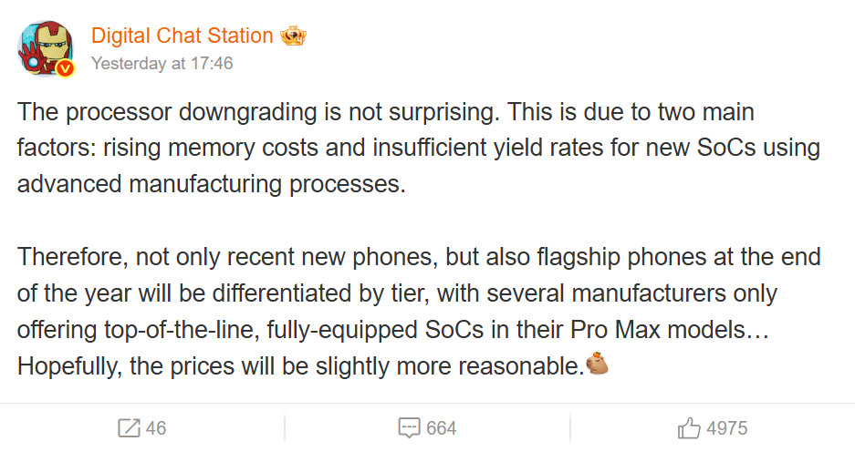 Согласно информации от авторитетного китайского инсайдера Digital Chat Station, несколько производителей смартфонов будут предлагать полностью оснащённые SoC только в своих топовых моделях «Ultra» или «Pro Max» из-за роста стоимости памяти и кризиса с поставками чипов. Хотя инсайдер прямо не упоминает TSMC, несложно догадаться, на кого указывает проблема.