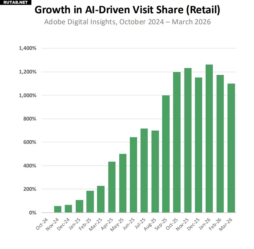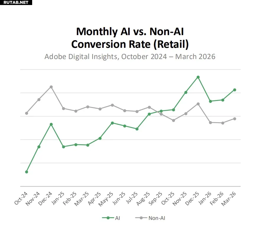 Данные Adobe показали, что в марте 2026 года конверсия трафика от ИИ была на 42% выше, чем у обычных покупателей, что стало новым рекордом. Это разворот тренда: в марте 2025 года конверсия ИИ-трафика была на 38% хуже, чем у людей.