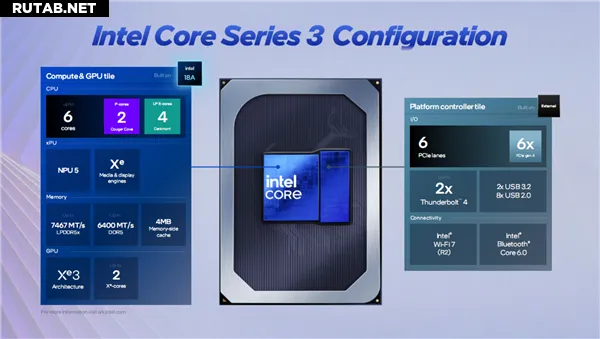 Архитектура Core 3 включает производительные ядра Cougar Cove (P-core) и энергоэффективные Darkmont (LPE-core), графику Xe3 и нейропроцессор NPU 5. Однако спецификации были значительно сокращены: максимум 2 P-ядра и 4 LPE-ядра (без E-ядер), 6 МБ кэша третьего уровня, 4 МБ кэша памяти (MSC), а также всего 2 графических ядра. Суммарная производительность GPU и NPU достигает 40 TOPS (21 TOPS и 17 TOPS соответственно).