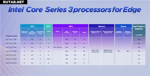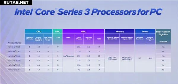 Линейка включает шесть моделей: Core 7 360/350, Core 5 330/320/315 и Core 3 304. Младшая модель Core 3 304 оснащена всего 5 ядрами (1P+4LPE) и одним графическим ядром.