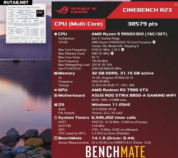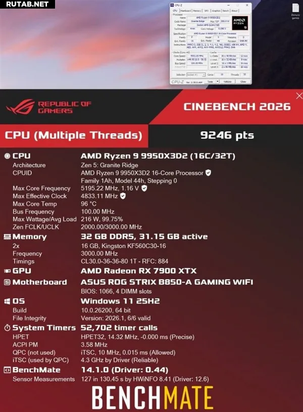 В более новом CineBench 2026 (многопоточный режим) чип набрал 9246 баллов, снова работая на 4.8 ГГц и нагреваясь до 96°C.