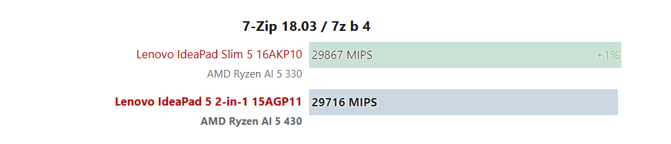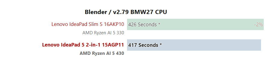 В многопоточных тестах производительность Ryzen AI 5 430 практически не изменилась по сравнению с предшественником. Результаты в Blender, 7-Zip и CineBench отличаются менее чем на 5%, а прирост частот также оказался весьма скромным.
