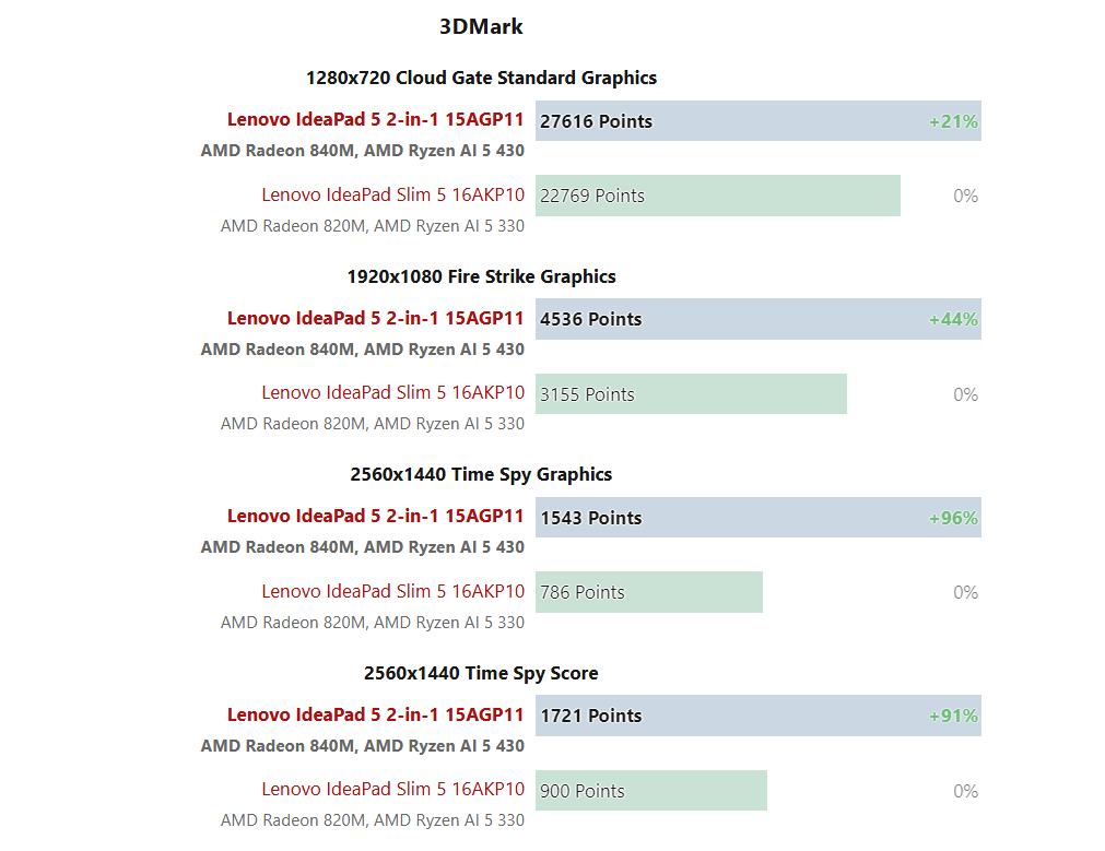 Наибольший апгрейд получила встроенная графика. Она была улучшена с Radeon 820M до Radeon 840M, что привело к росту результатов в 3DMark в 1.5–2 раза.