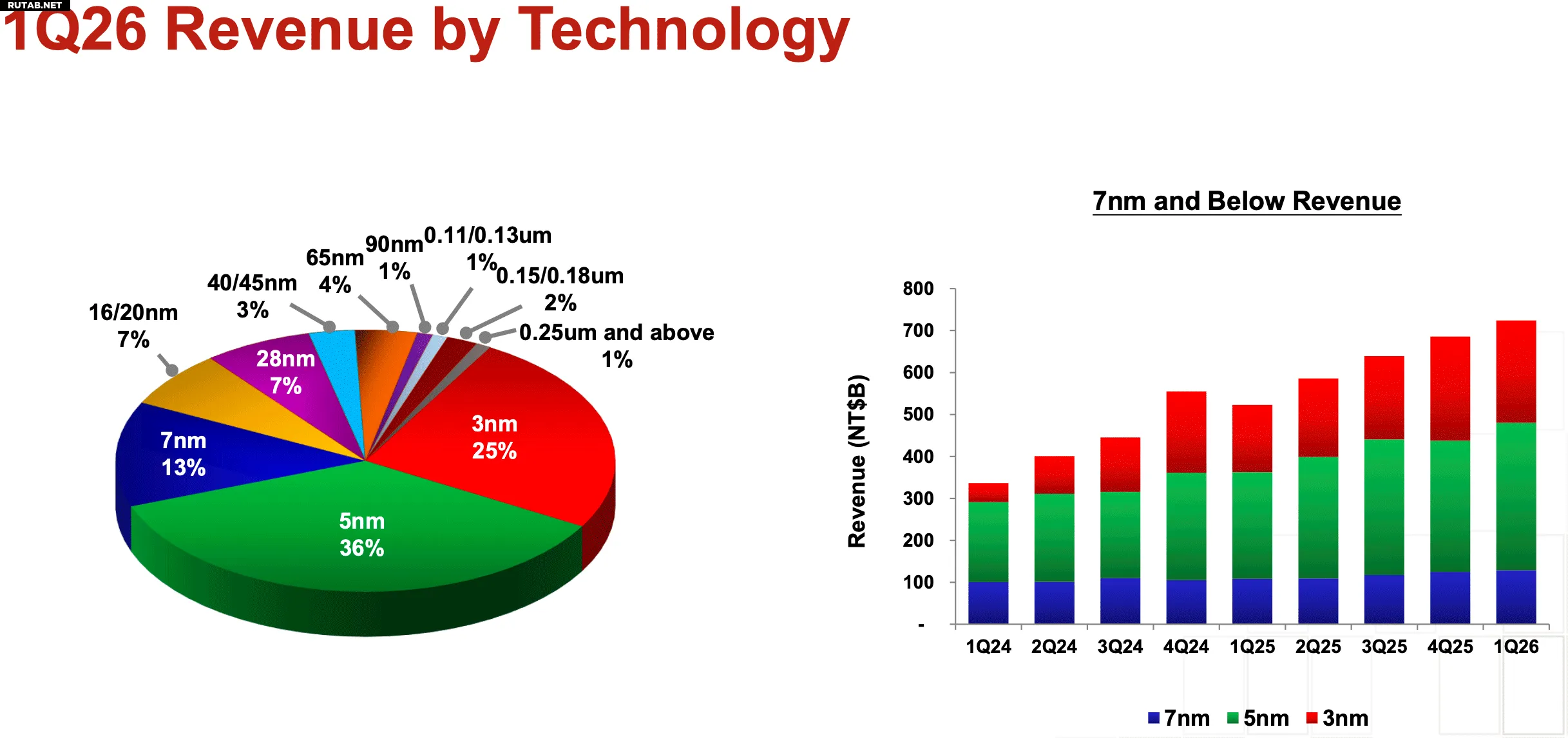 Среди технологий производства 5-нм техпроцессы (N5) принесли 36% выручки от продажи пластин в квартале, во многом благодаря успеху ускорителей ИИ Blackwell от Nvidia. На 3-нм (N3) пришлось 25%, а на 7-нм — 7%. Передовые нормы (7 нм и тоньше) в сумме обеспечили 74% доходов компании.