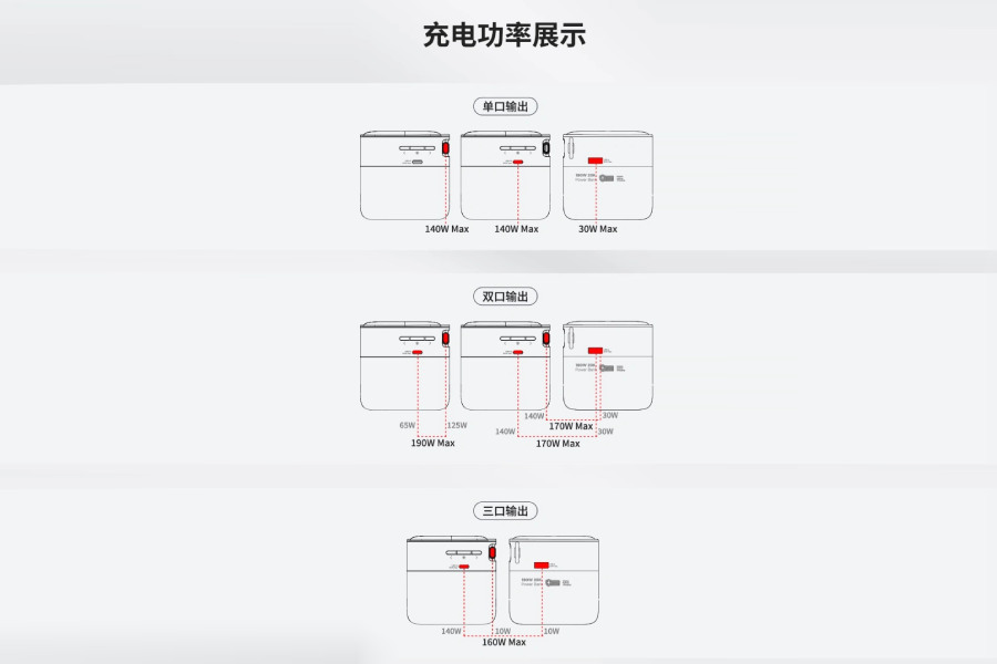 Устройство поддерживает суммарную выходную мощность до 190 Вт через несколько портов. По заявлению Lenovo, один порт может выдавать до 140 Вт, чего достаточно для питания ноутбуков, таких как ThinkPad, ThinkBook, Apple MacBook и Huawei MateBook. При использовании нескольких портов одновременно можно заряжать несколько устройств, включая телефоны и ноутбуки, без значительного снижения скорости.