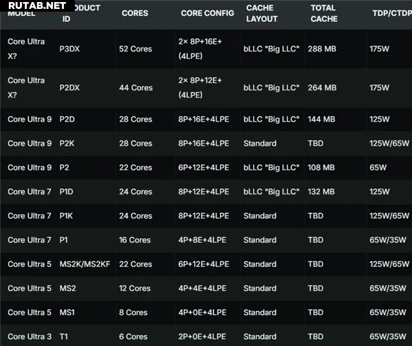 Максимальный TDP флагманской модели составит 175 Вт, в то время как у остальных моделей этот показатель будет варьироваться от 35 Вт до 125 Вт. Модели начального уровня Ultra 3 и Ultra 5 будут иметь TDP 35 Вт, а разблокированные версии — до 65 Вт. Стандартные модели получат TDP 125 Вт, а для некоторых также будут предложены энергоэффективные версии на 65 Вт.
