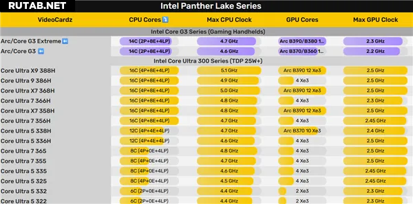 Arc G3 Extreme обладает максимальной турбо-частотой 4.7 ГГц. Его встроенная графика, изначально известная как Arc B380, теперь называется Arc B390 (аналогична модели в процессорах Core Ultra X 3x8H). Предположительно, она оснащена 12 ядрами Xe3 с максимальной частотой 2.3 ГГц.