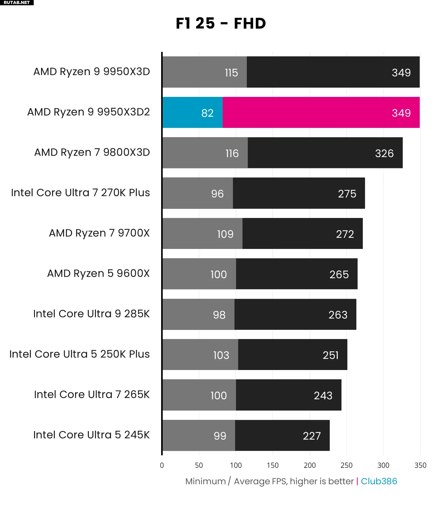- «F1 25»: Средний FPS у 9950X3D2 и 9950X3D оказался идентичным, однако минимальный FPS у новинки был на 28% ниже. Это указывает на возможные проблемы со стабильностью кадровой частоты при переключении потоков между CCD.