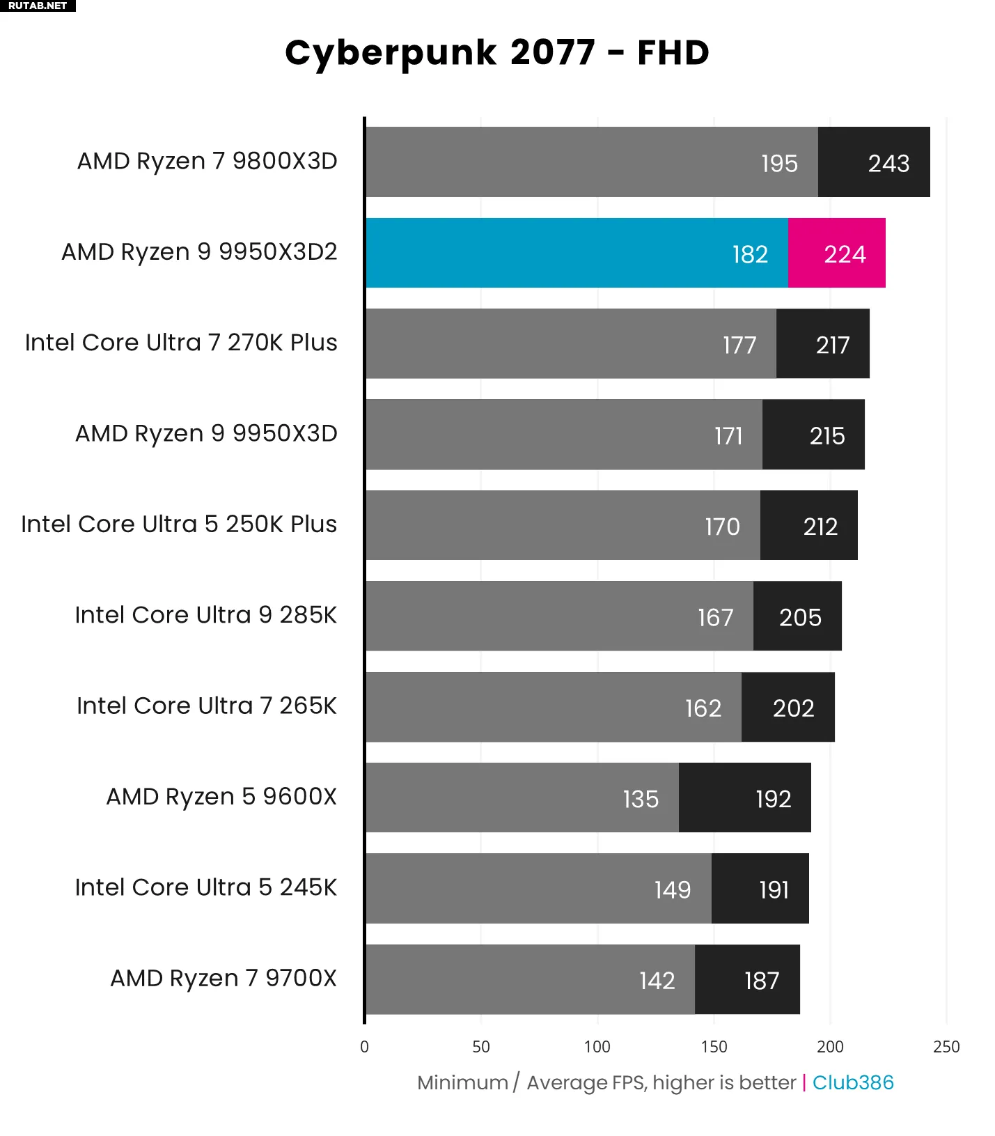 - «Киберпанк 2077»: В этом GPU-зависимом проекте все процессоры показали близкие результаты. 9950X3D2 выдал 182-224 кадра в секунду, что на 4-6% быстрее 9950X3D, но при этом 9800X3D и вовсе преодолел планку в 240 fps.