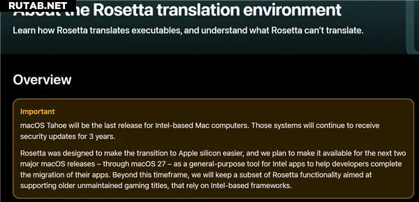 Компания также напомнила разработчикам об изменениях в технологии Rosetta 2. Этот фреймворк был создан для облегчения перехода с архитектуры Intel на Apple Silicon, позволяя запускать старые приложения. С уходом Intel Mac его миссия подходит к концу.