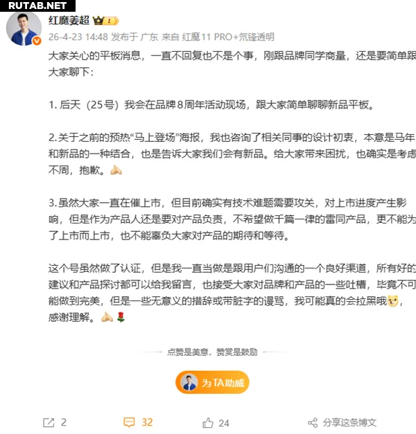 Сегодня Цзян Чао прокомментировал ситуацию, сообщив, что 25 апреля, в рамках 8-летия бренда, будут представлены некоторые подробности о новом планшете. Он также объяснил, что изначальный постер с надписью «скоро» был задуман как сочетание символа года Лошади и выхода новинки, что должно было сигнализировать о запуске продукта. Признав, что такая формулировка могла ввести в заблуждение, он принес извинения пользователям.