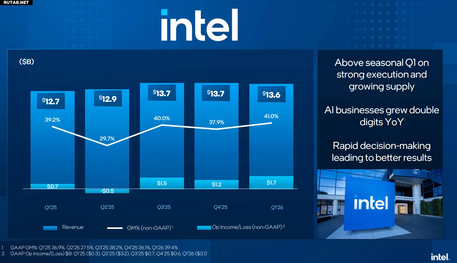 Компания Intel опубликовала финансовый отчёт за первый квартал 2026 года, сообщив о выручке в размере 13,6 млрд долларов (~1,09 трлн рублей), что на 7,2% больше по сравнению с аналогичным периодом прошлого года. Хотя рост не был столь взрывным, как в сегменте графических процессоров или памяти, он всё же превзошёл ожидания рынка.