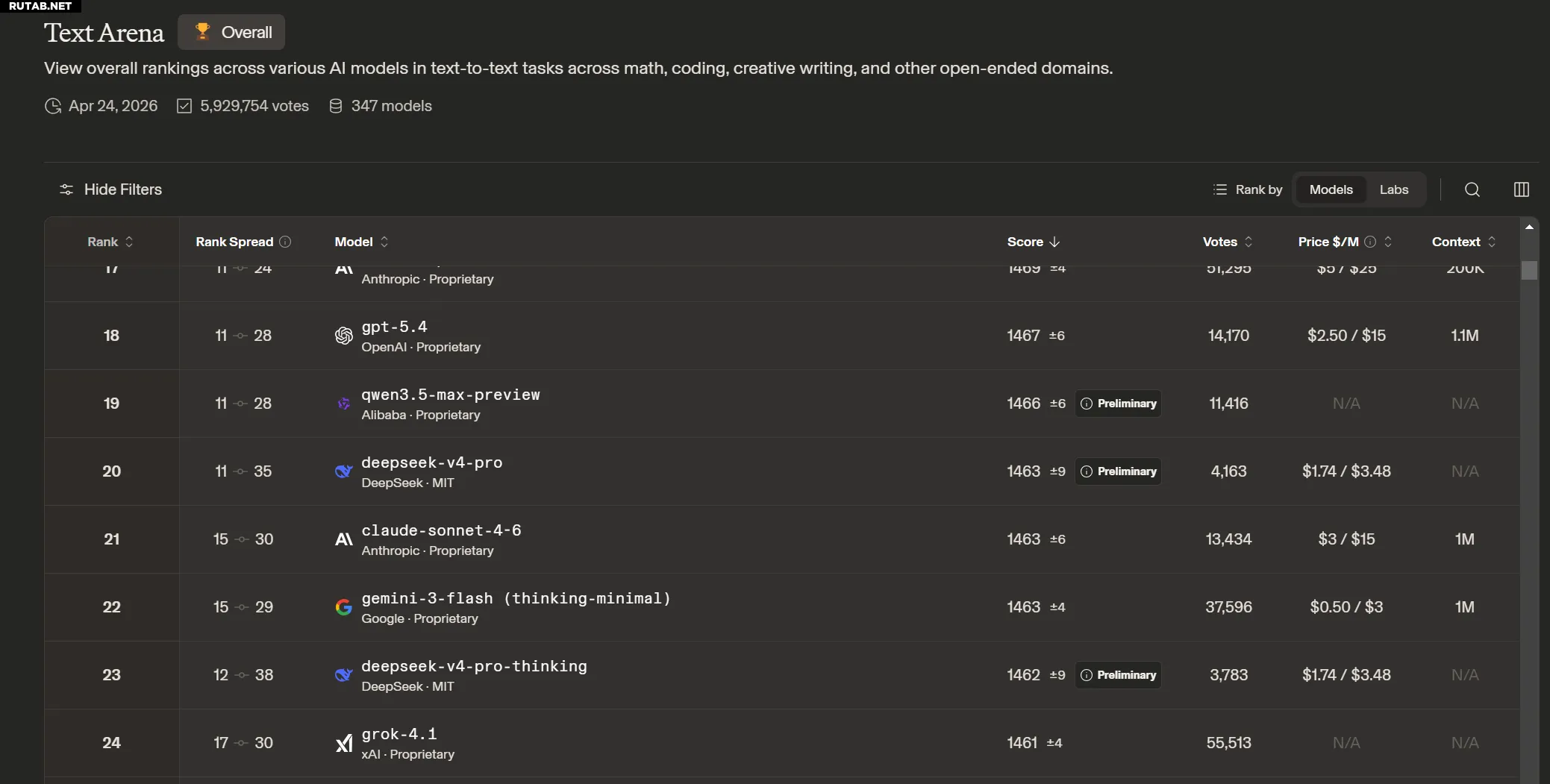 Помимо официальных данных, в сети появились результаты независимых тестов и рейтингов. На площадке arena.ai оцениваются текстовые способности и навыки программирования (мультимодальность V4 не поддерживает).