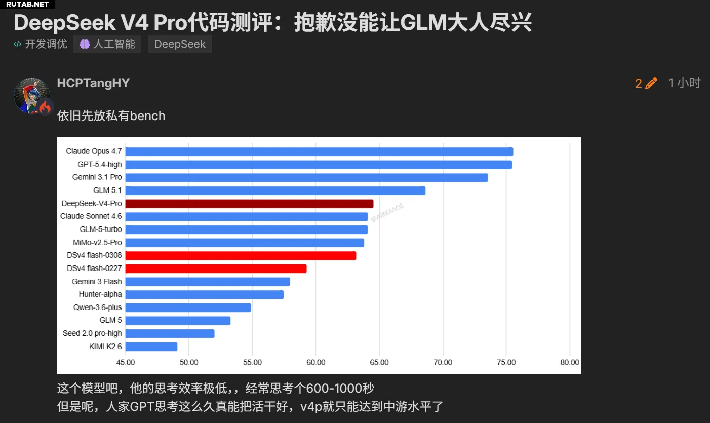 Пользователи из сообщества Linux.do провели собственное сравнение и пришли к выводу, что V4 Pro уступает даже GLM-5.1 и существенно отстаёт от топ-3. Таким образом, DeepSeek V4 действительно демонстрирует серьёзный прогресс в программировании, превосходя Sonnet 4.5 и приближаясь к Opus 4.6, но до его режима рассуждений ещё далеко.