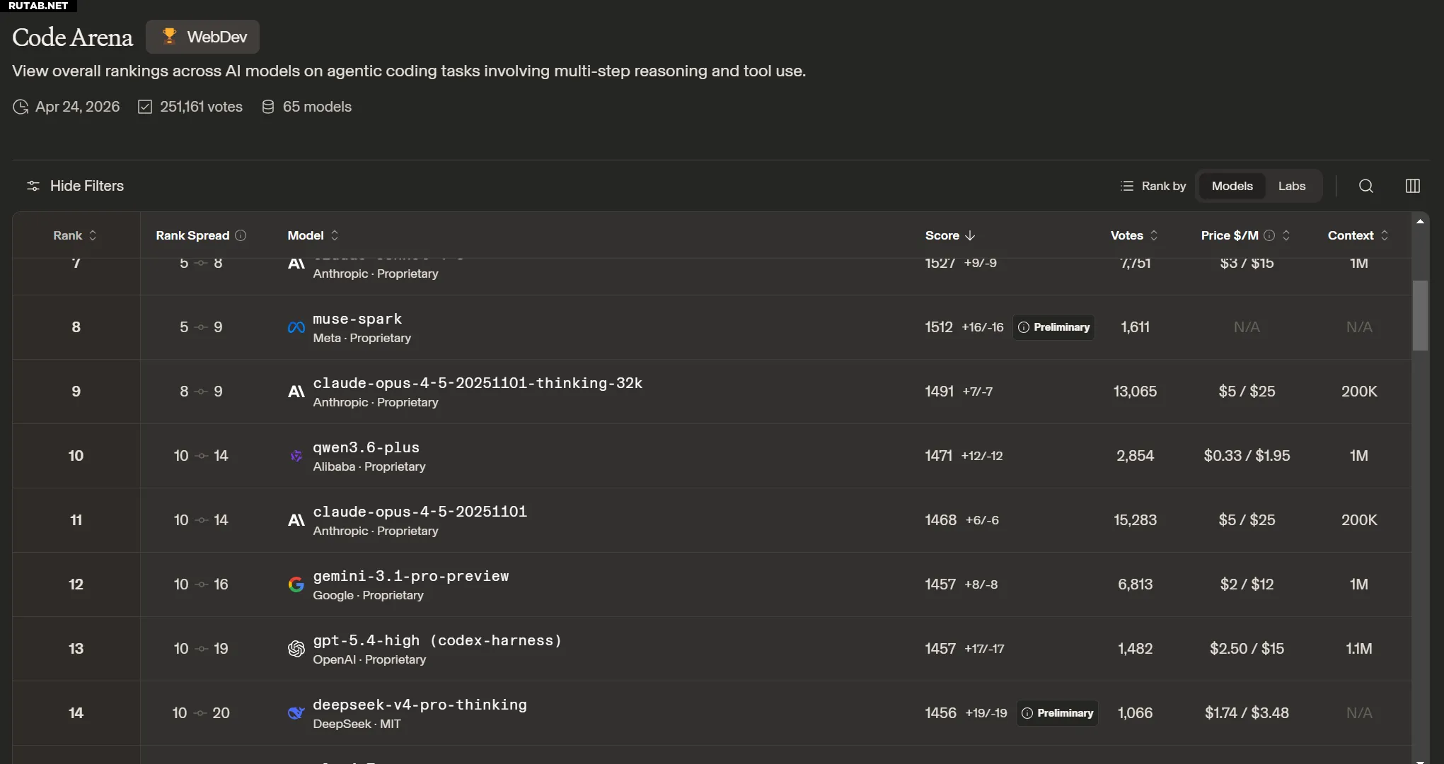 В категории кодинга DeepSeek V4 — на 14-й позиции. Лучшей среди китайских моделей здесь оказалась GLM-5.1, занявшая 5-е место.