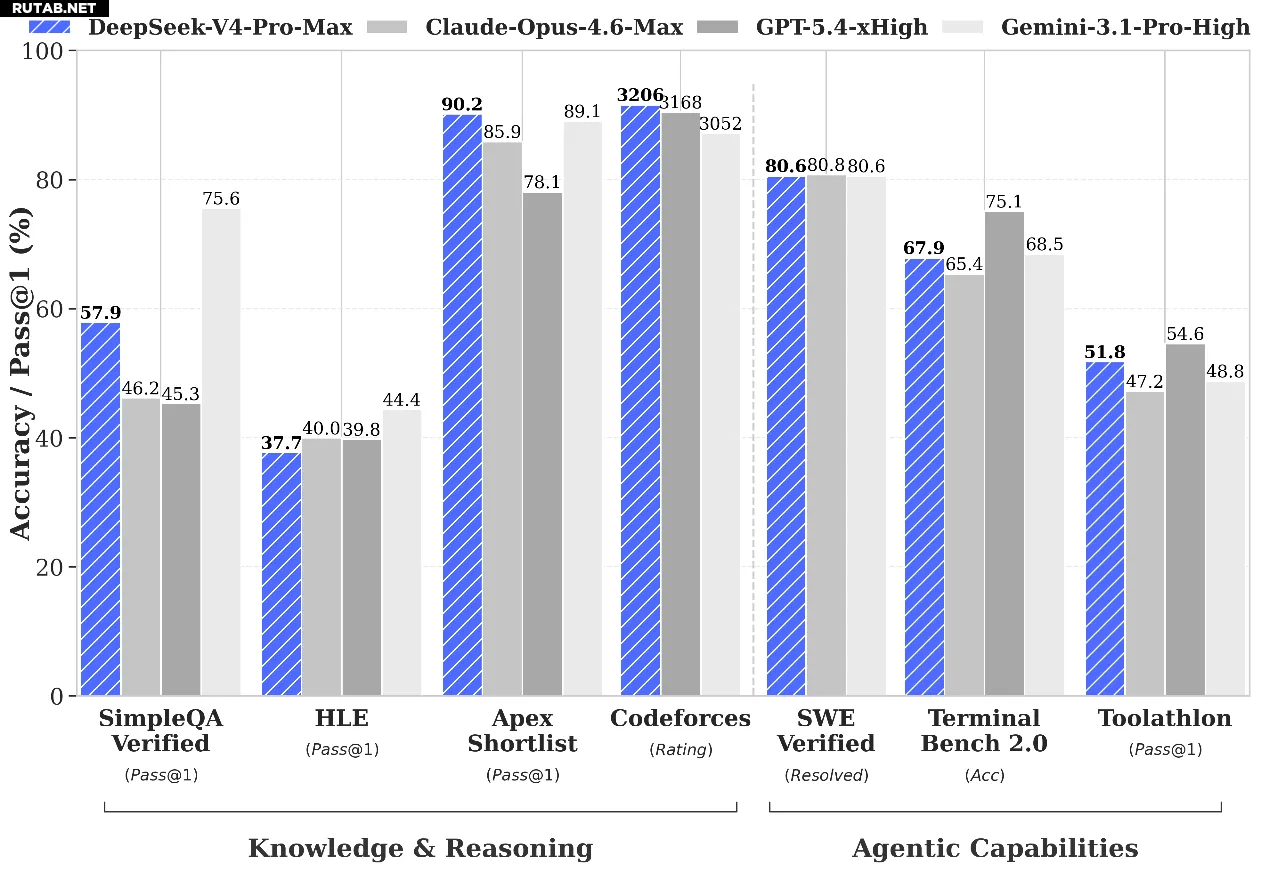 По данным рейтинга vals.ai, V4 стала лучшей среди открытых моделей, заняв девятое место в мире, однако отрыв от первой тройки по-прежнему значителен.