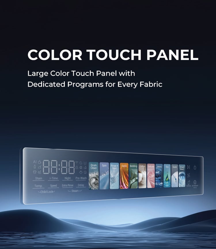 Haier оснастила устройства полноцветной сенсорной панелью AI и поддержкой Wi-Fi для упрощения управления. Дисплей включает предустановленные программы для определённых типов тканей, таких как хлопок, джинсовая ткань и сари.