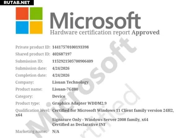 Китайская компания «砺算科技» (Lisuan Technology) официально получила сертификацию Microsoft WHQL, став первой GPU-компанией в Китае и четвертой в мире, удостоенной этого «пропуска» высшего уровня.