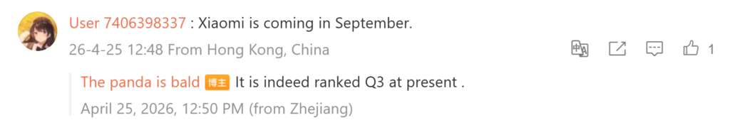На данный момент нет ясности, будет ли новый складной телефон Xiaomi называться Xiaomi Mix Fold 5 или Xiaomi 17 Fold. Рекомендуется дождаться дальнейших отчётов для подтверждения его окончательного маркетингового названия. В комментариях к посту в Weibo Bald Panda также намекнул, что предстоящий складной аппарат Xiaomi в настоящее время запланирован к запуску в третьем квартале. Поскольку серия Xiaomi 18 ожидается в сентябре, вполне вероятно, что складной телефон может дебютировать в июле.