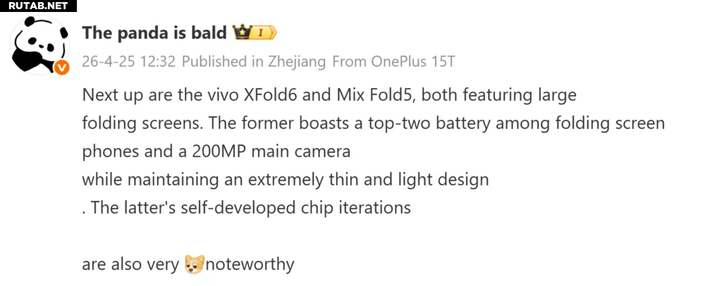 По информации инсайдера Bald Panda, следующими крупными складными смартфонами, которые должны выйти на рынок, станут Vivo X Fold 6 и Xiaomi Mix Fold 5. Инсайдер утверждает, что складной аппарат Vivo может получить один из самых больших аккумуляторов, когда-либо виденных на складных телефонах, а также 200-мегапиксельную основную камеру. Несмотря на большой аккумулятор, устройство, как сообщается, сохранит чрезвычайно тонкий и лёгкий дизайн.