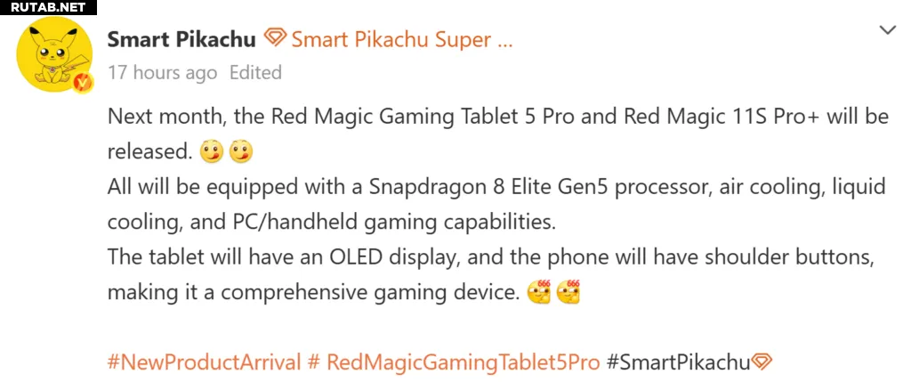 Согласно информации от инсайдера Smart Pikachu, Red Magic Gaming Tablet 5 Pro и Red Magic 11S Pro+ будут представлены в Китае в мае. Он добавил, что оба устройства получат чипсет Snapdragon 8 Elite Gen 5, а также систему воздушного охлаждения и комбинацию технологий воздушного и жидкостного охлаждения для отвода тепла, обеспечивая игровые возможности на уровне ПК.