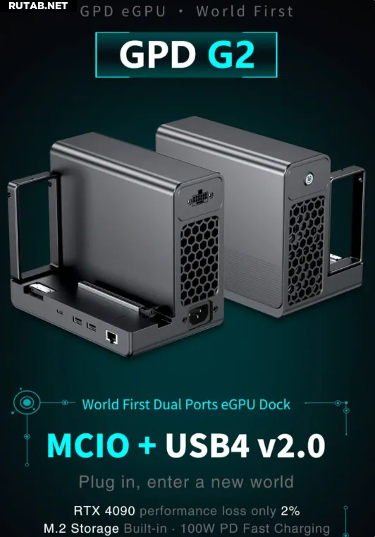 Док-станция GPD G2 позиционируется как первая в мире eGPU с двумя интерфейсами: MCIO и USB4 v2. Она оснащена встроенным блоком питания, слотом для видеокарты PCIe, отсеком для M.2 SSD, двумя портами USB Type-A и одним LAN, а также поддерживает подачу питания до 100 Вт (PD-out).