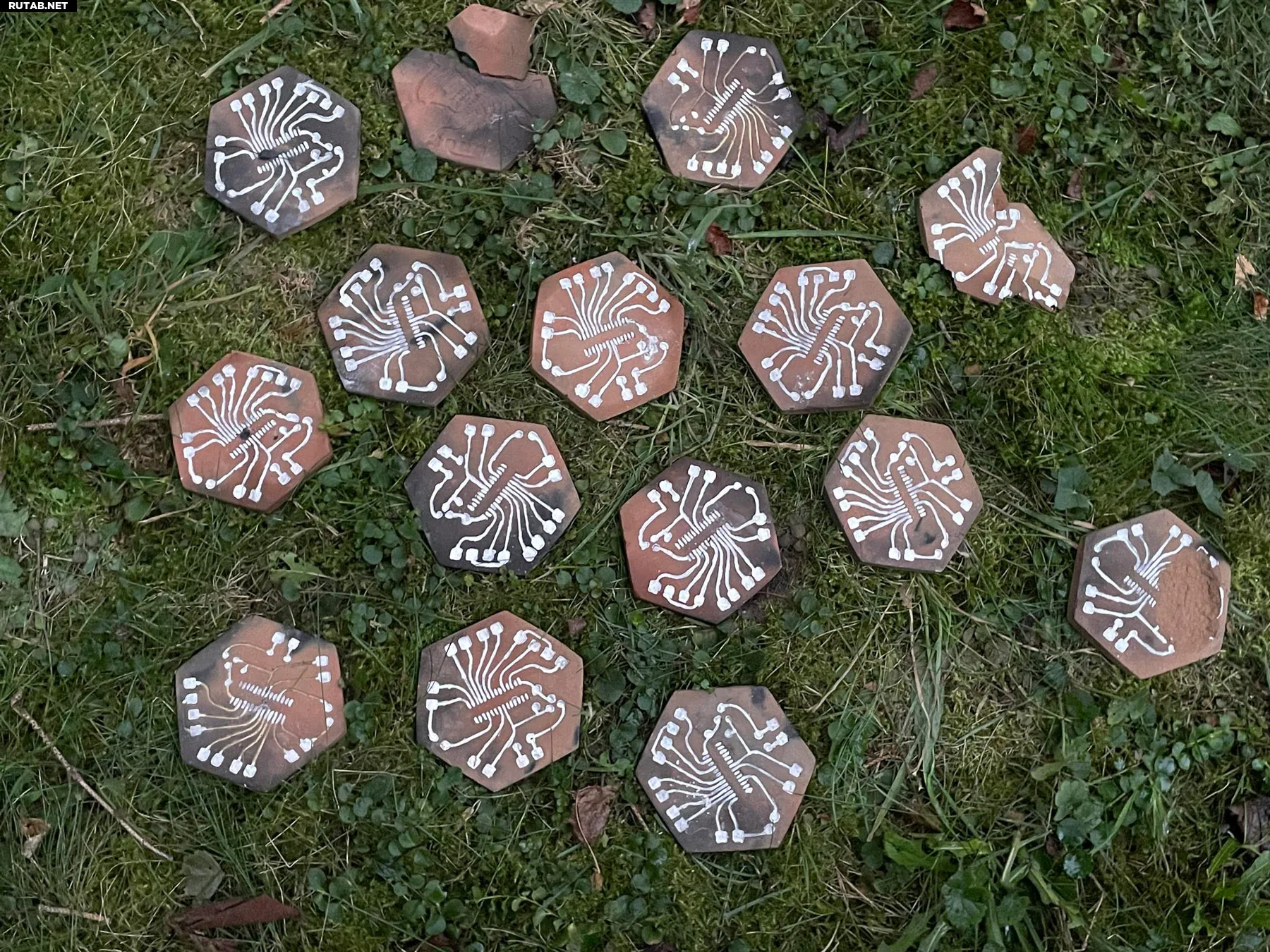 После высыхания краски платы готовы к обжигу. В блоге подробно описывается процесс с использованием доисторической техники. Одной из проблем, которую пришлось решать, стала усадка глины при обжиге (до 5%), что потребовало корректировки размеров штампа.