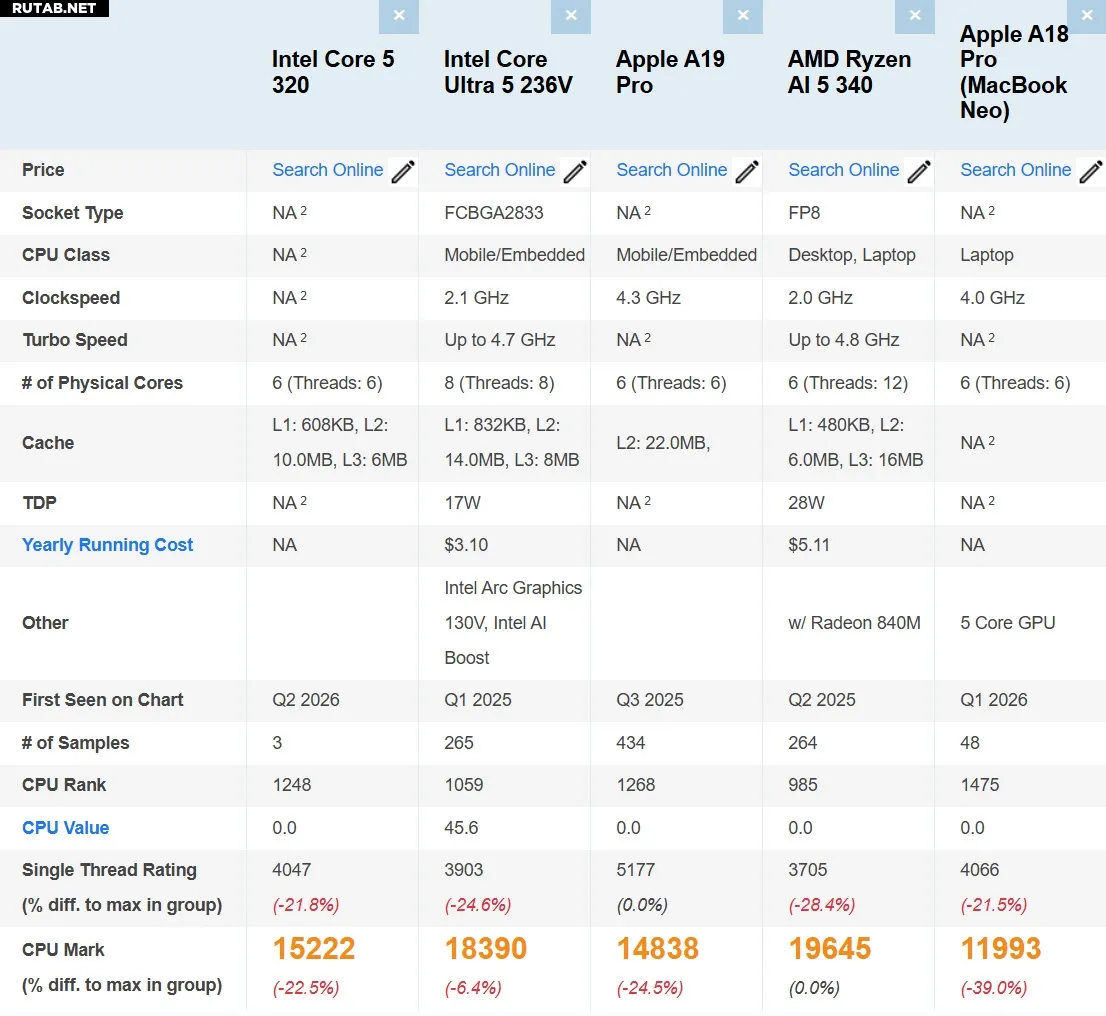 Intel Core 5 320 обходит Apple A18 Pro на 27% в многопоточном тесте PassMark