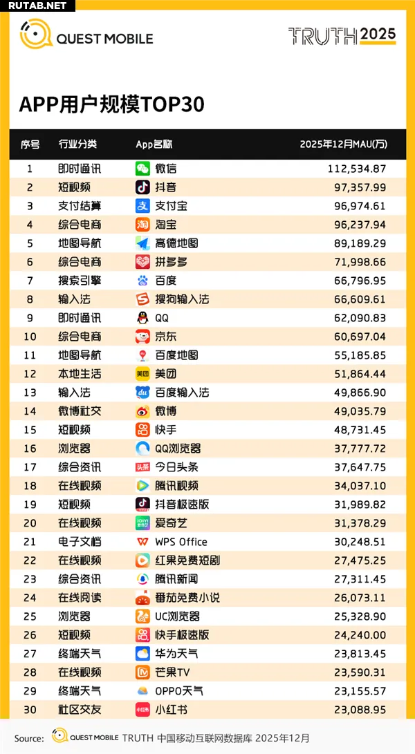 Согласно предыдущему отчету QuestMobile, по состоянию на декабрь 2025 года единственным приложением с MAU более 1 миллиарда был WeChat, тогда как аудитория TikTok составляла 973 миллиона пользователей.