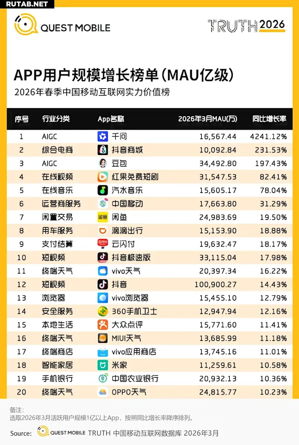 Согласно данным аналитической компании QuestMobile, опубликованным в отчете о весеннем рейтинге мобильного интернета в Китае за 2026 год, месячная активная аудитория (MAU) приложения TikTok (抖音) впервые превысила отметку в 1 миллиард пользователей, увеличившись на 14,43% по сравнению с аналогичным периодом прошлого года.