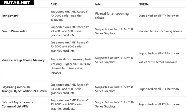 - AMD: LinAlg::Matrix доступен только на серии RX 9000, остальные функции — на RX 7000 и RX 9000.