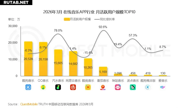 Данные показывают, что Kugou Music (酷狗音乐) остаётся лидером с 205 миллионами активных пользователей в месяц, а QQ Music (QQ音乐) занимает второе место с 201 миллионом. Разрыв между ними невелик, и они продолжают формировать дуополию на рынке онлайн-музыки.