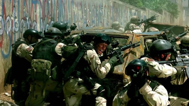 «Чёрный ястреб» пересказывает хронику военных событий 1993 года в горячей точке близ города Могадишо, Сомали. Тогда американская армия устроила рейд, целью которого был захват вооружённых отрядов группировки под предводительством Мохаммеда Фараха Айдида.