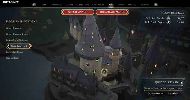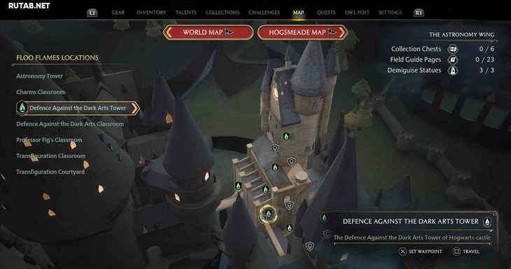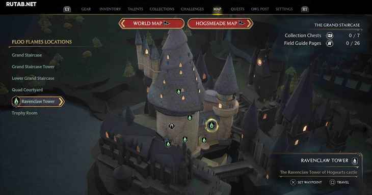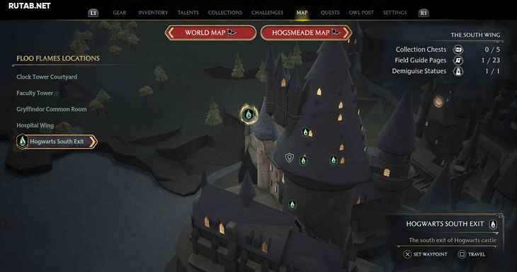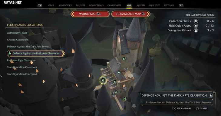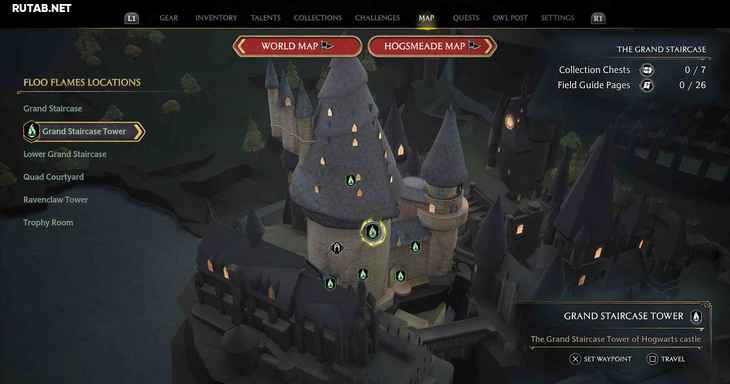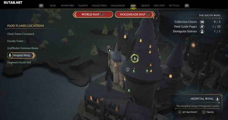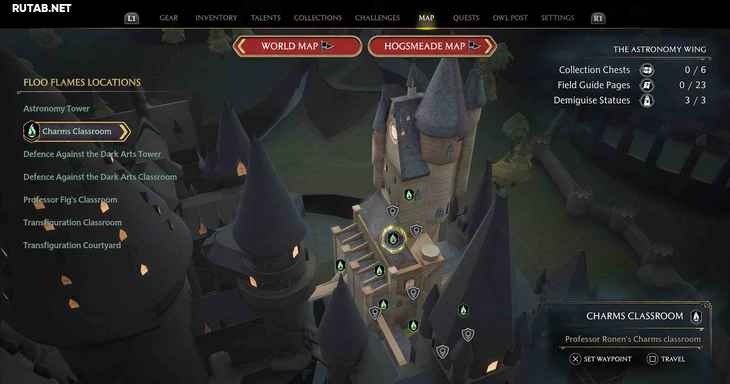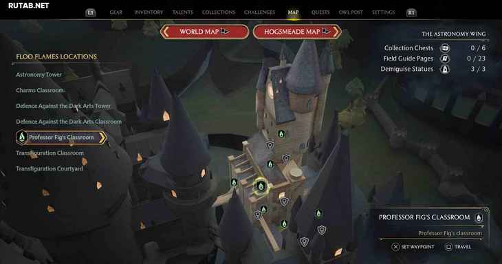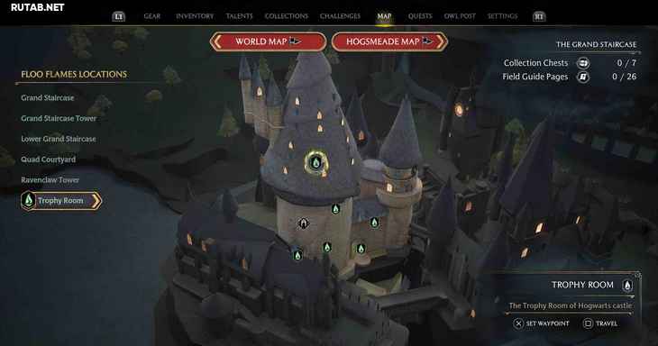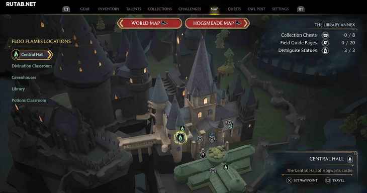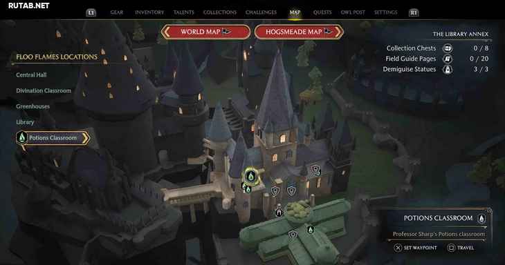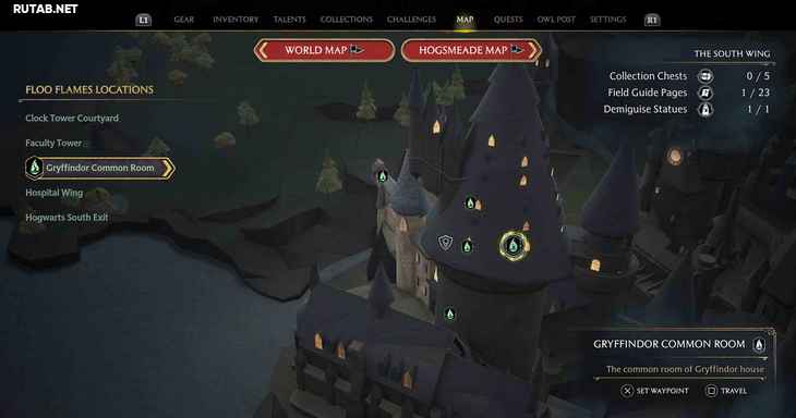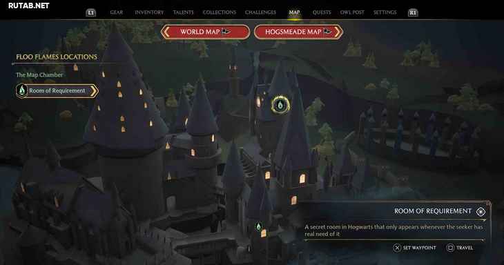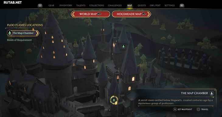 В замке Хогвартс вы можете либо щелкнуть по значку флага, чтобы открыть разделы замка, либо щелкнуть левую боковую панель на экране карты, чтобы быстро выбрать летучее пламя. Чтобы вернуться в Зал картографии и Выручай-комнату, вы можете выбрать «Секретные комнаты» в левой части экрана карты Хогвартса, а затем выбрать эти комнаты.