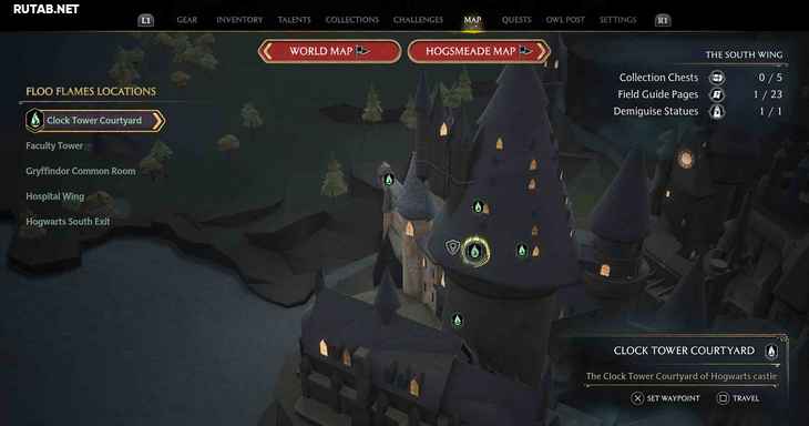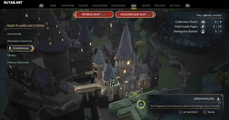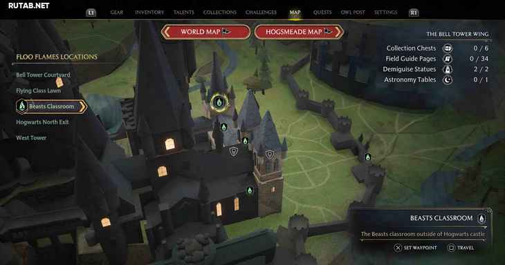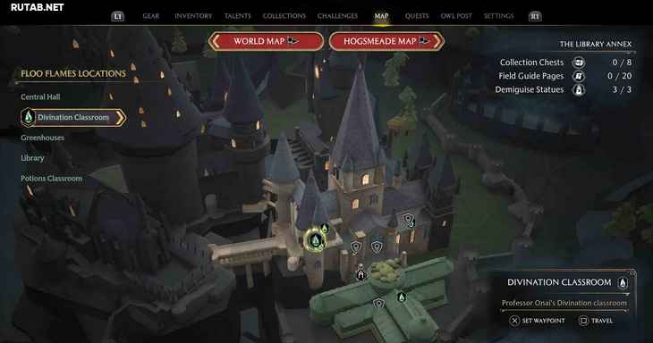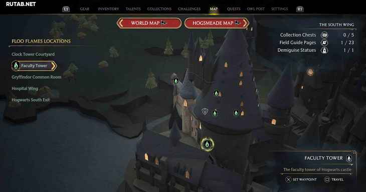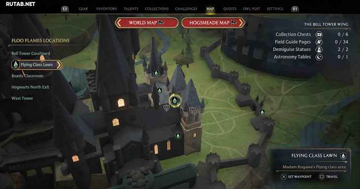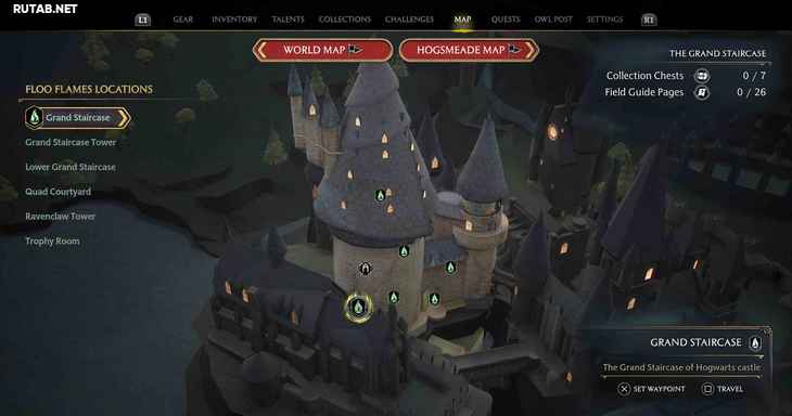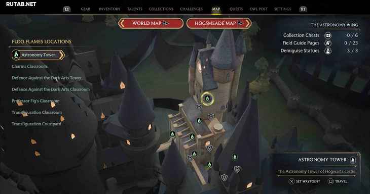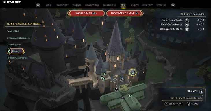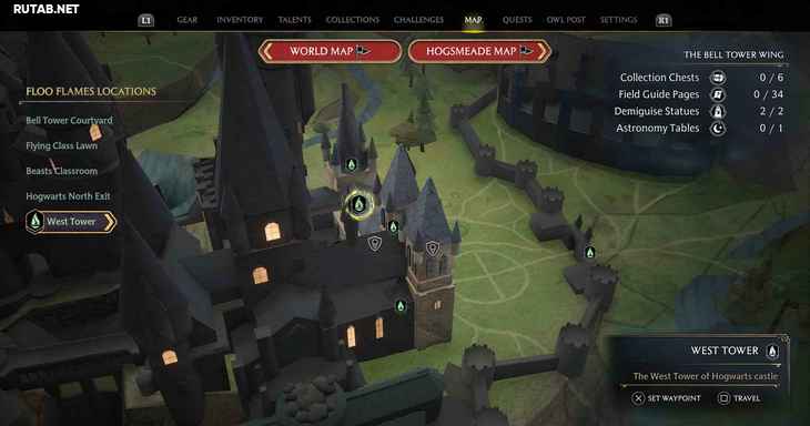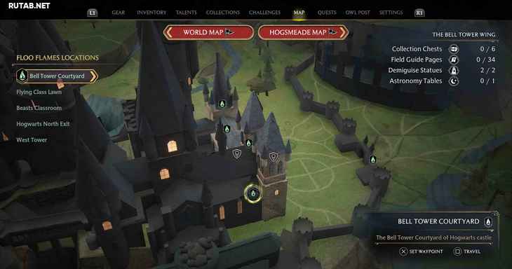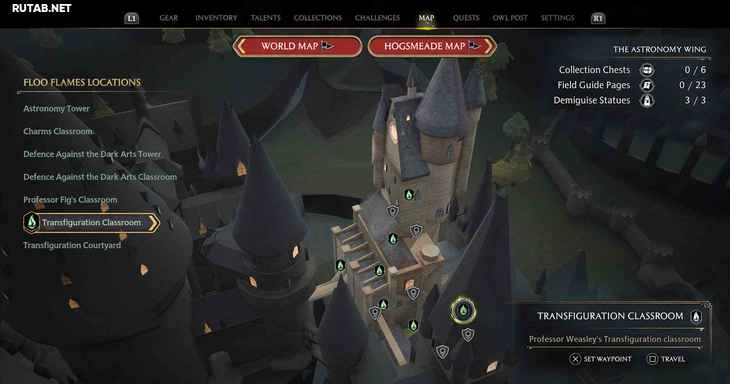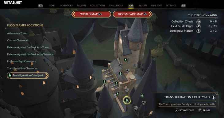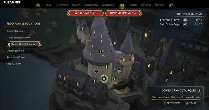 В замке Хогвартс вы можете либо щелкнуть по значку флага, чтобы открыть разделы замка, либо щелкнуть левую боковую панель на экране карты, чтобы быстро выбрать летучее пламя. Чтобы вернуться в Зал картографии и Выручай-комнату, вы можете выбрать «Секретные комнаты» в левой части экрана карты Хогвартса, а затем выбрать эти комнаты.