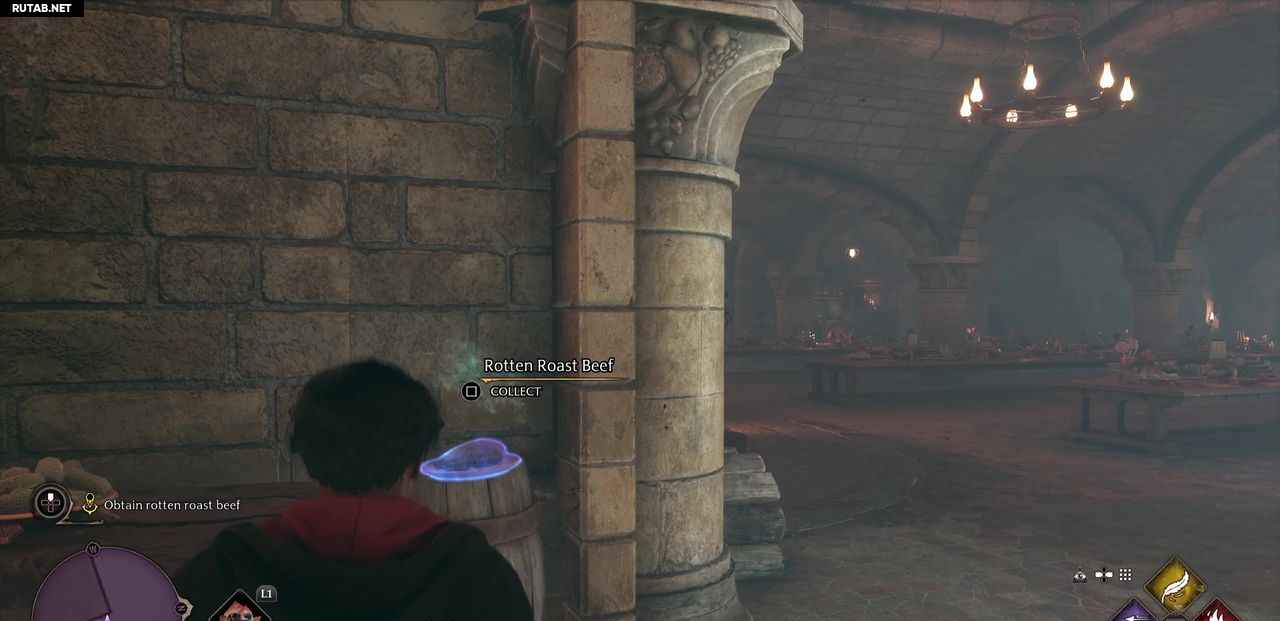 Следуйте за сэром Николасом к Лестнице Хогвартса и вниз по направлению к эльфийским покоям на кухне. Когда вы дойдете до кухонной двери, удерживайте