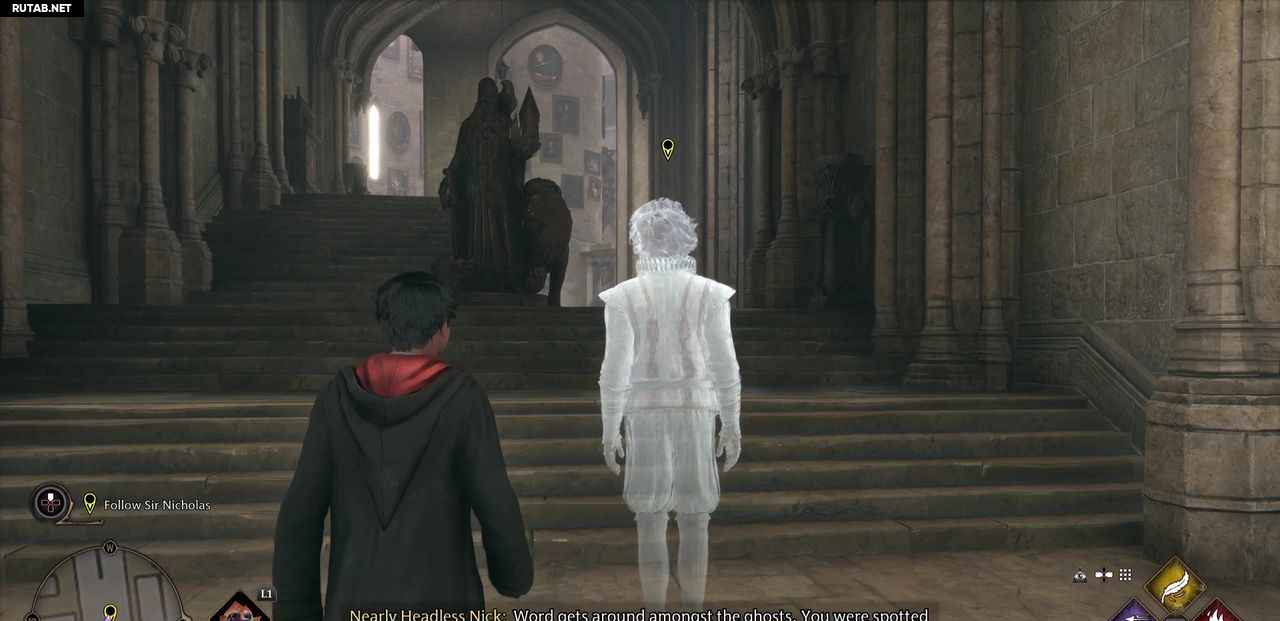 Перейдите к маркеру следующего квеста, используя Зачарованный компас, чтобы найти дорогу, и поговорите с Почти Безголовым Ником у песочных часов факультетов.