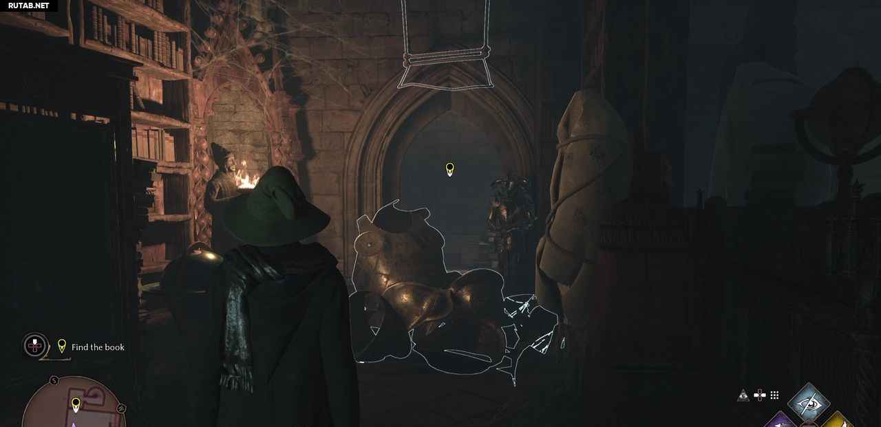 Найдите на миникарте красную мишень, перемещающуюся по области, и примените базовое заклинание к сломанной броне на другой стороне комнаты.